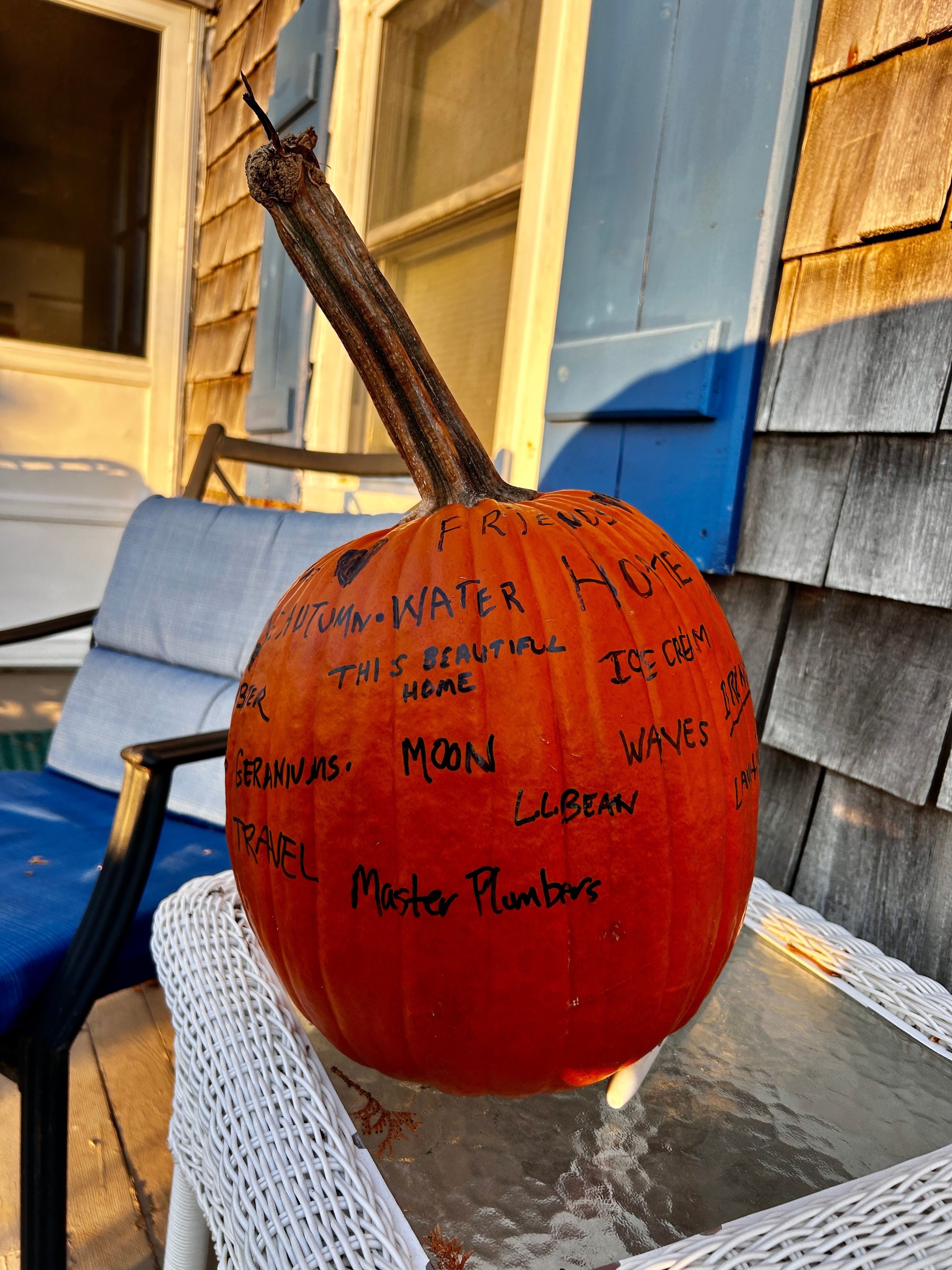 Afterwards, he and I stepped outside to turn the water back on and walked right past my gratitude pumpkin. I grabbed my black marker. Since Oct. 1, I’ve been adding words of gratitude to my pumpkin as a reminder to be grateful.