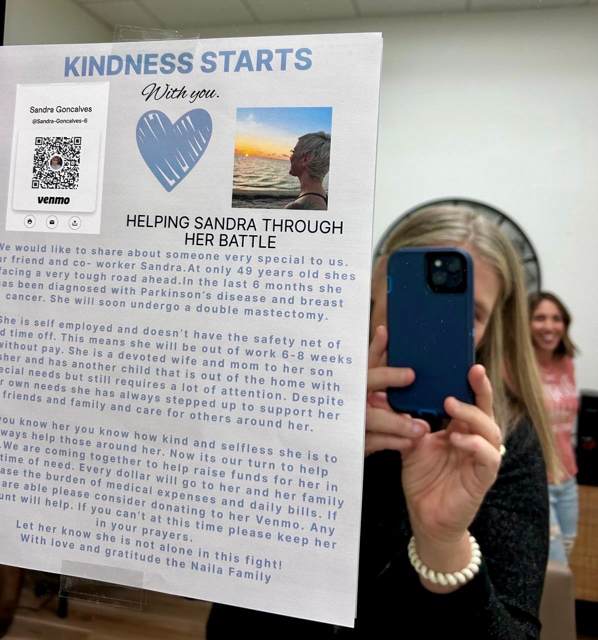 Dawn explained that Sandra, a hair stylist in the salon, had been diagnosed with breast cancer and recently had a double mastectomy. She will lose at least 8 weeks of work.In addition, Sandra, 49, was diagnosed with early Parkinson’s Disease and has a special needs son.