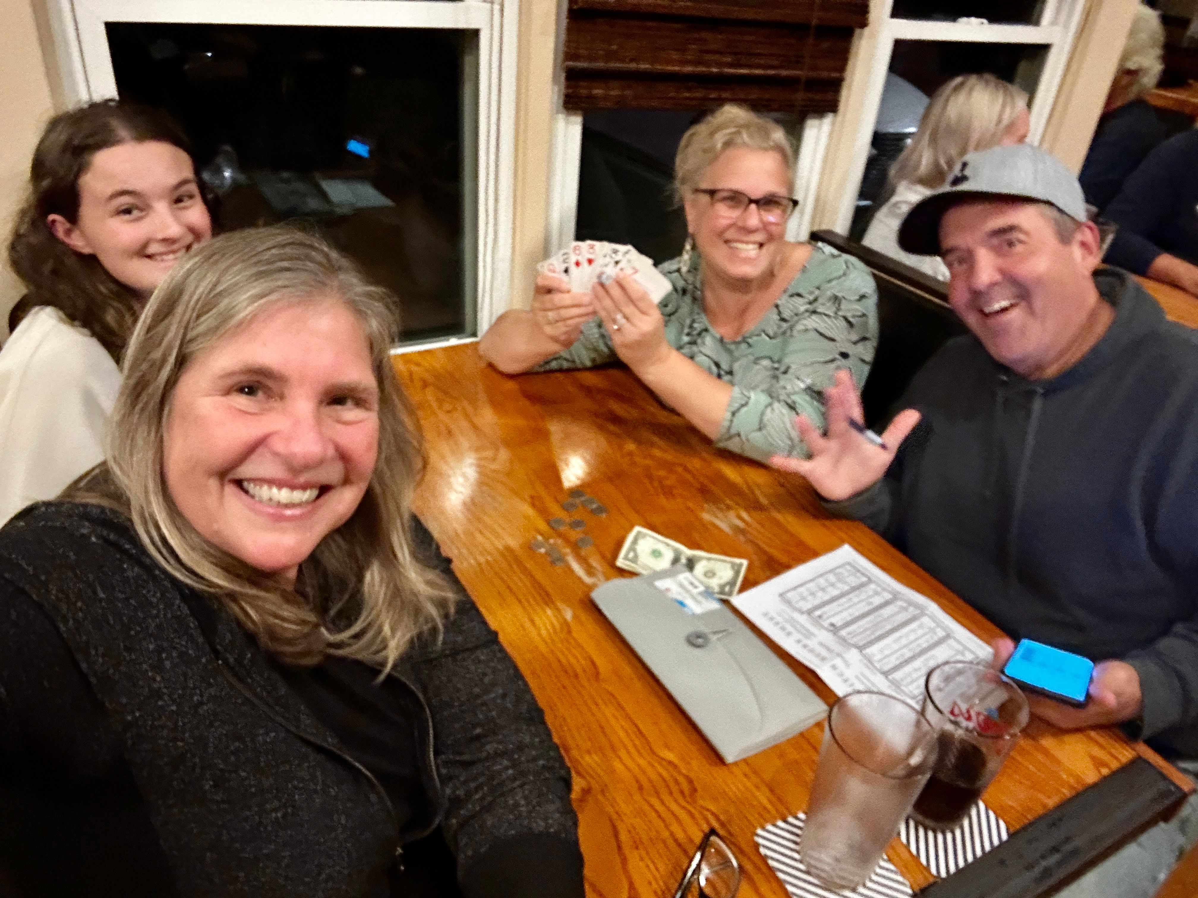 My card partner, Selena, and I overbid a few times. So, I offered her my small pile of change, which she was basically forced into taking so I could be kind. But she did admit that it was extra kind because her husband was having such a terrible night at cards that she needed her quarters to dig him out!