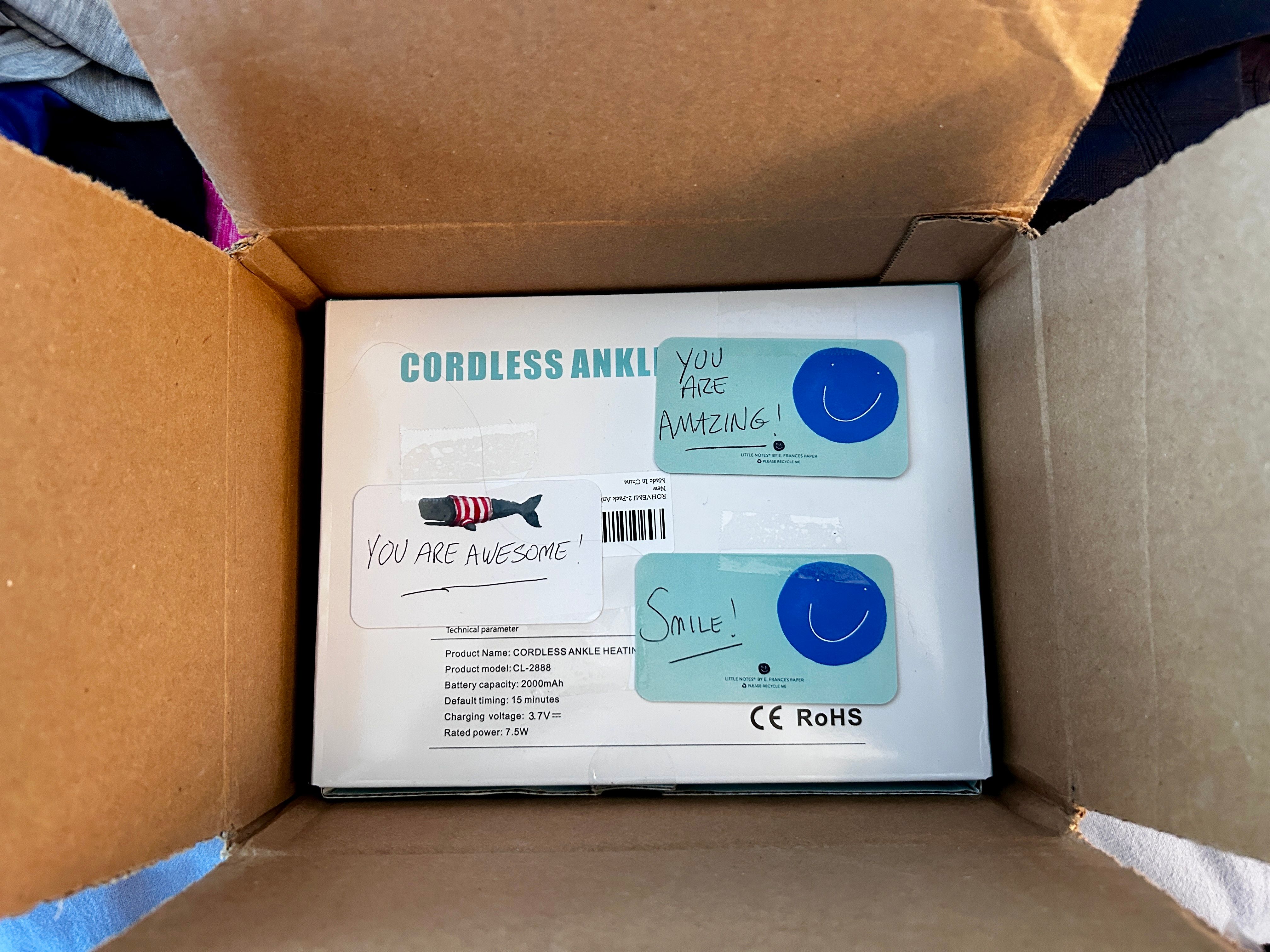 I bought an ankle warmer from Amazon for my adorable, amazing ankle (see kindness day June 7: talking nicely to your healing self) and it didn’t really work as expected. So, I returned it this morning at Staples. I decided it would be kind to put in some words of encouragement to the person who has to deal with this return - and maybe make them smile. I can’t imagine that too many returns have smiley faces on them.