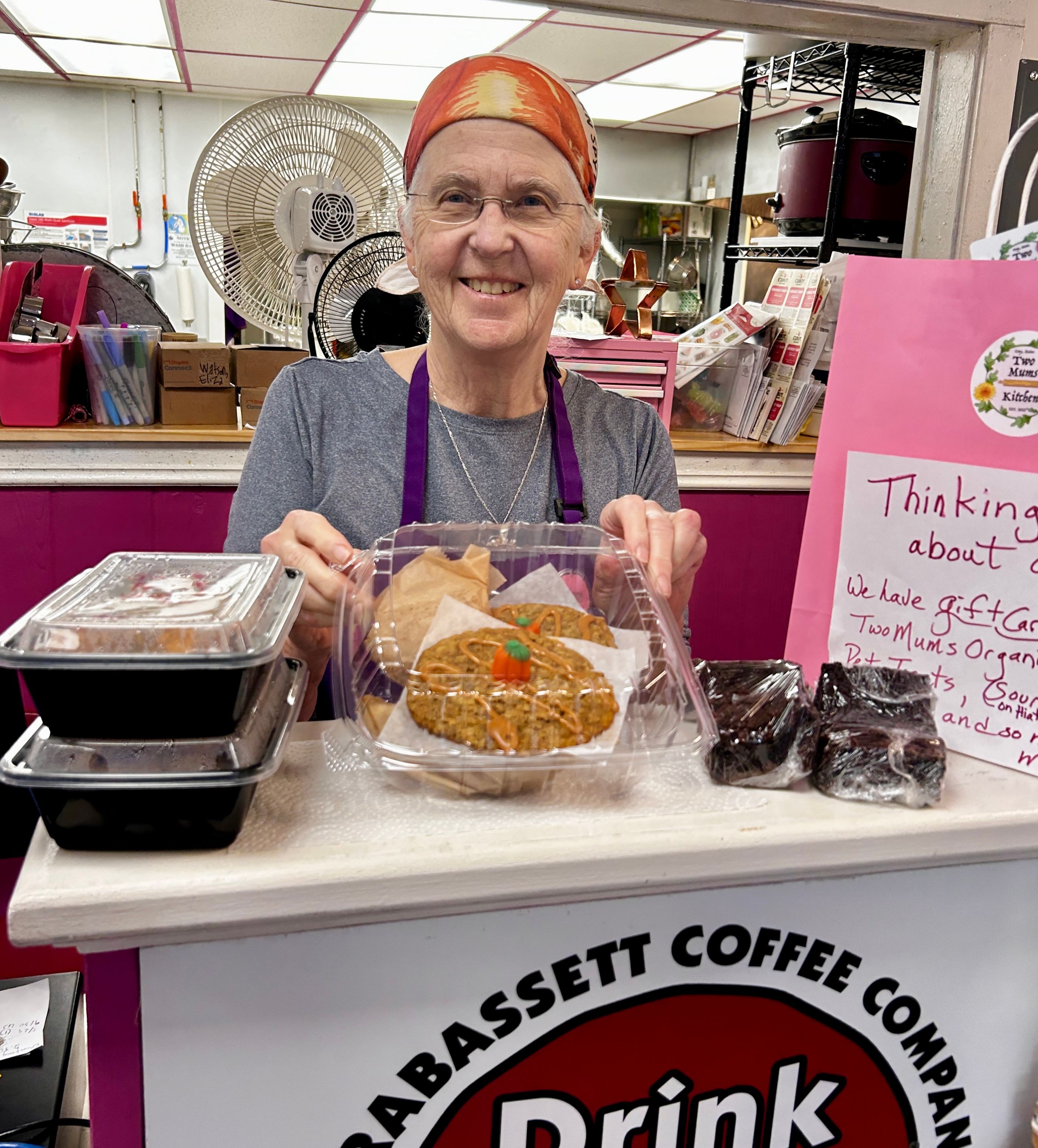I’m in Maine with a friend who is participating in a jewelry workshop with a group of people from around the country. So, I thought it would be kind to get them some treats.I went to this adorable restaurant called Two Mums Kitchen. I met Cindy, the owner. She and her daughter started baking and selling about three years ago. Their goal is to make delicious food that area families can afford despite rising food costs.