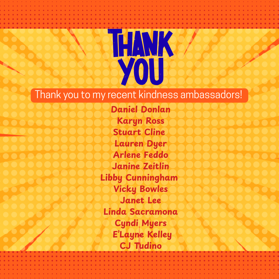 I am so grateful for this tremendous community that makes me remember what the best of humanity looks like. You are holding doors open for others literally and figuratively. When I get weary from the world's events, I remember all of you. Thank you for standing up for kindness and creating rays of light that are so sorely needed.I also want to thank my latest batch of kindness ambassadors who I am so grateful for while I was getting back on my feet!