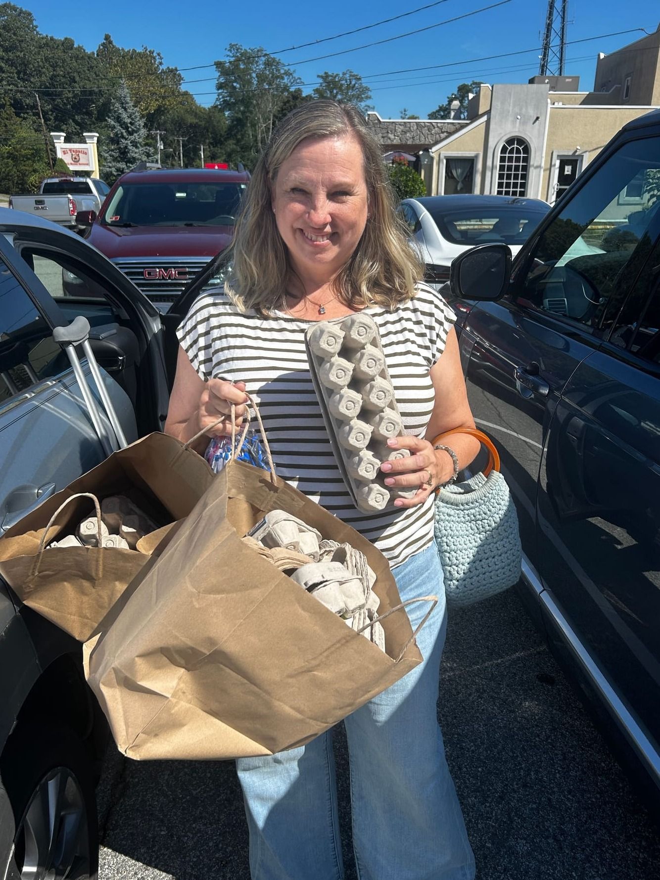 Day 245 of a year of kindness - My mother and I have been saving paper egg cartons. The cupboard was bursting with them.My friend, Melissa Hubbard Steadman, told me that she would repurpose them. So, we met for breakfast today and I handed her a lot of egg cartons. She immediately delivered some to Aquidneck Food Pantry. They get large crates of eggs and always need egg cartons to deliver to singles or families.